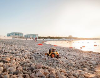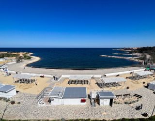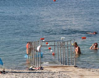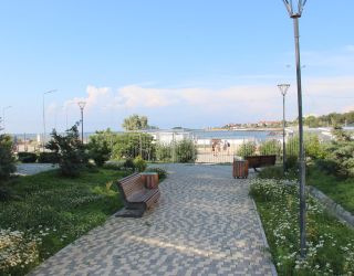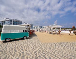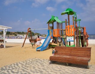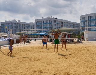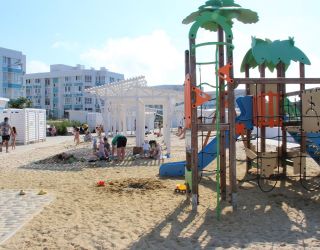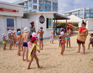 В 20 метрах от корпуса на берегу бухты находится песчано-галечный пляж. Пляж хорошо оборудован: есть раздевалки, навесы, шезлонги, площадка для пляжного волейбола, спортивная площадка с необходимыми тренажерами, кафе, ларьки с мороженым, детская площадка . На побережье будет комфортно отдыхать родителям с детьми - вход в воду пологий, а около берега мелко.