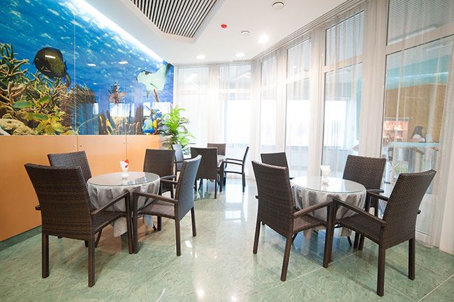 Столовая санатория работает по системе заказного меню. Обеденная зона включает в себя 3 зала: Бирюзовый, Малахитовый и Янтарный. Последний из них предполагает ресторанное обслуживание с элементами шведского стола, и принимает гостей из номеров повышенной комфортности. Во второй половине дня открывается бар «Вита» на 40 мест, который также служит банкетной площадкой.