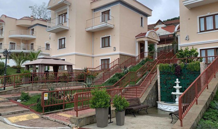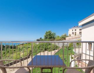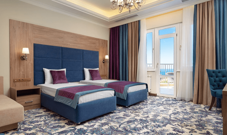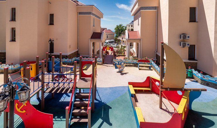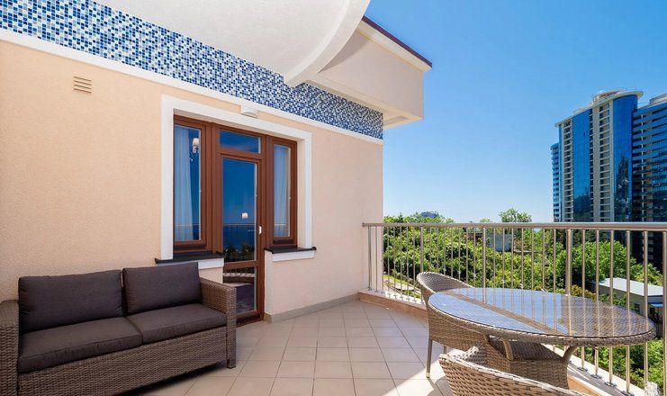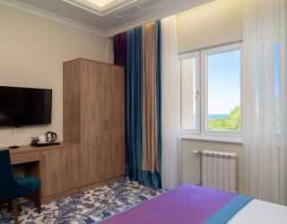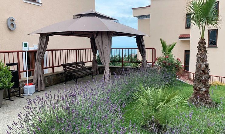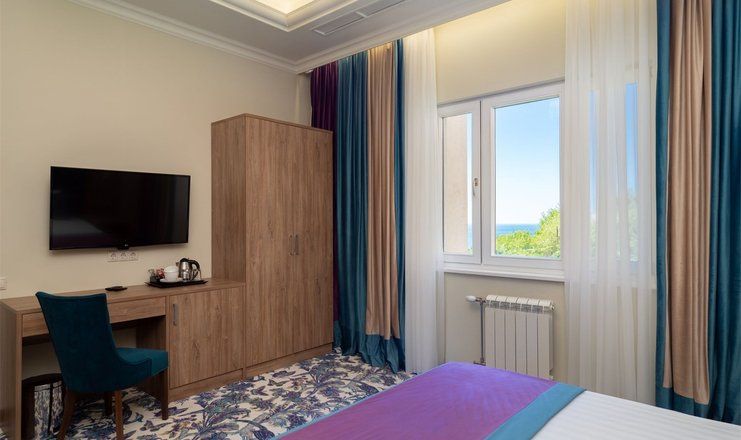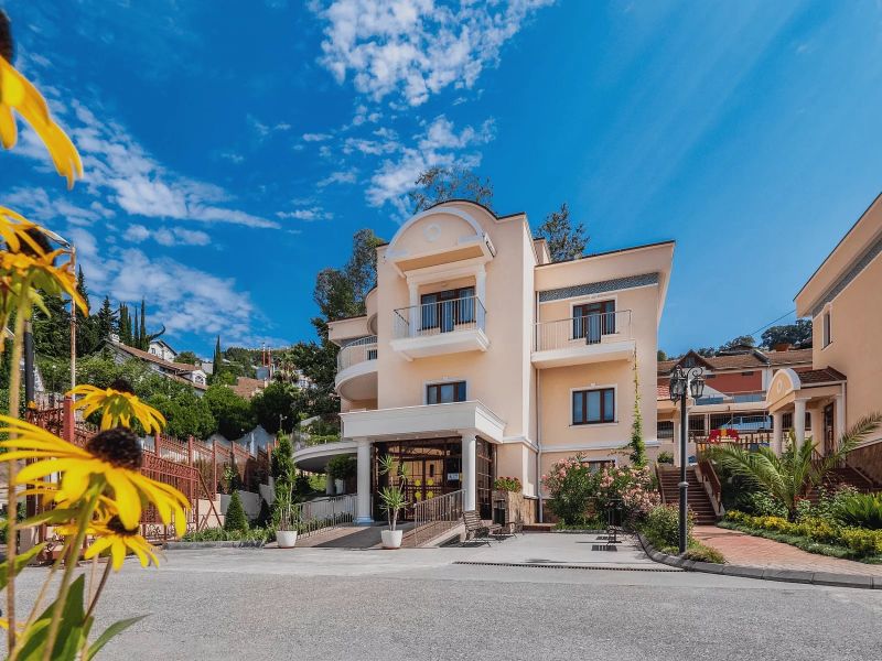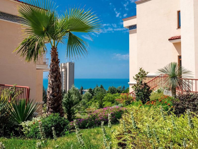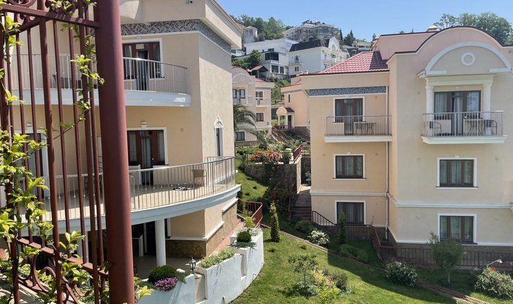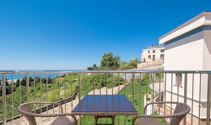 Санаторий с собственной озелененной территорией 1,8 га, где произрастает более 100 видов растений располагает оборудованными мебелью беседками для отдыха. В восьми 3-этажных коттеджах 65 новых номеров с видом на море. В комнатах выполнен современный дизайнерский ремонт, установлена эргономичная мебель для отдыха, есть рабочая зона, места для хранения одежды и личных вещей, мини-холодильник, сейф, кондиционер, телевизор с плоским экраном, телефон, чайная станция, сушилка для белья. Санузел индивидуальный, с душевой кабиной, полотенцами, туалетными принадлежностями и феном. В номерах Джуниор сюит просторные балконы с видом на море и мебелью.