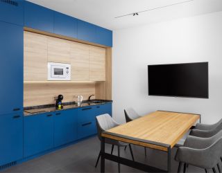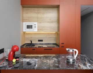 В каждом номере двуспальная кровать, гладильная доска, утюг, микроволновая печь, телевизор, электрочайник, фен, посуда и кухонные принадлежности, по запросу предоставляется капсульная кофемашина.