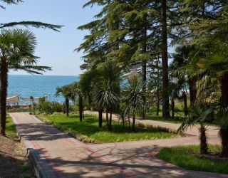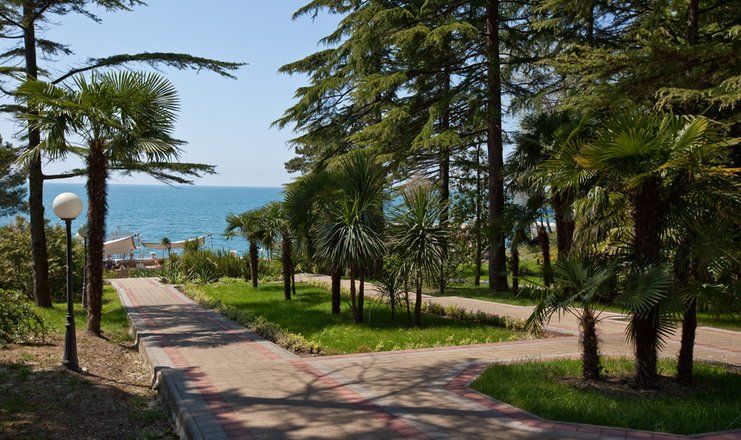 На поезде до ж/д вокзала Сочи, далее на маршрутном такси № 17, 4, 50 до остановки «Отель Родина».