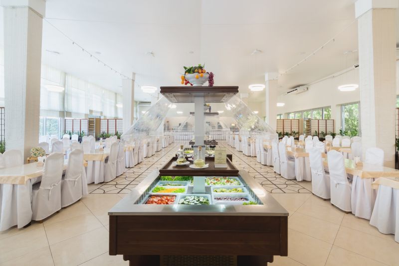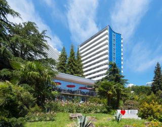 Жилой корпус санатория в 16 этажей возвышается на первой береговой линии. Номерной фонд санатория представлен следующими категориями: одноместный стандарт, двухместный стандарт, номер «комфорт» и «семейный» двухкомнатный номер. Все номера санатория комфортные и оборудованы современной мебелью. Трехразовое питание в санатории организовано в ресторане по системе шведский стол. Также на территории есть панорамный ресторан «Палуба» и кафе «Хуторок».