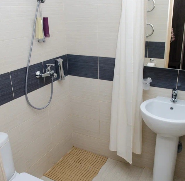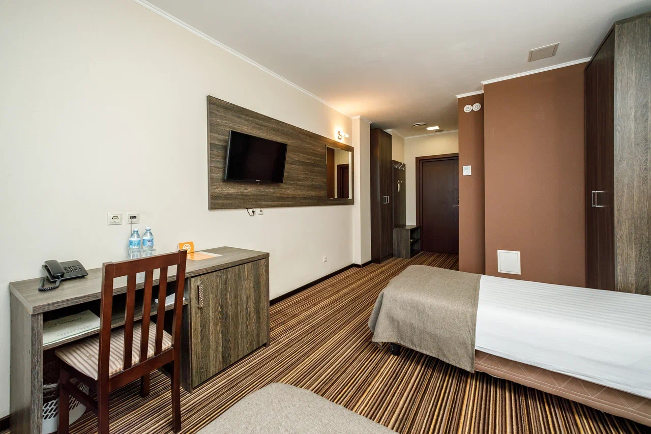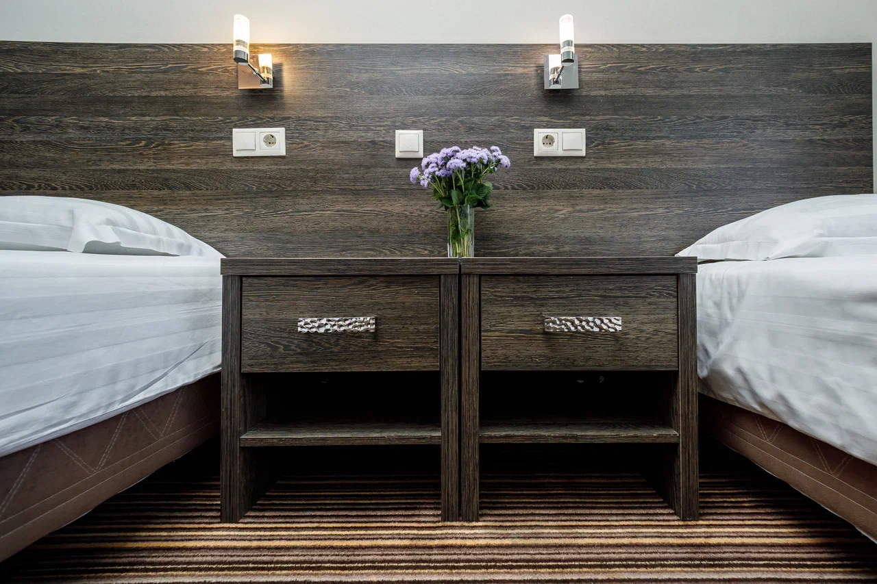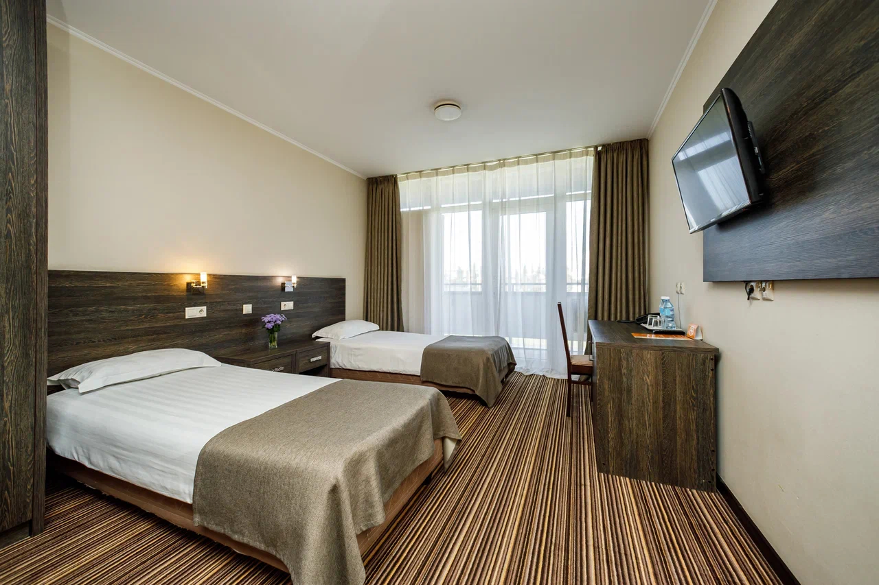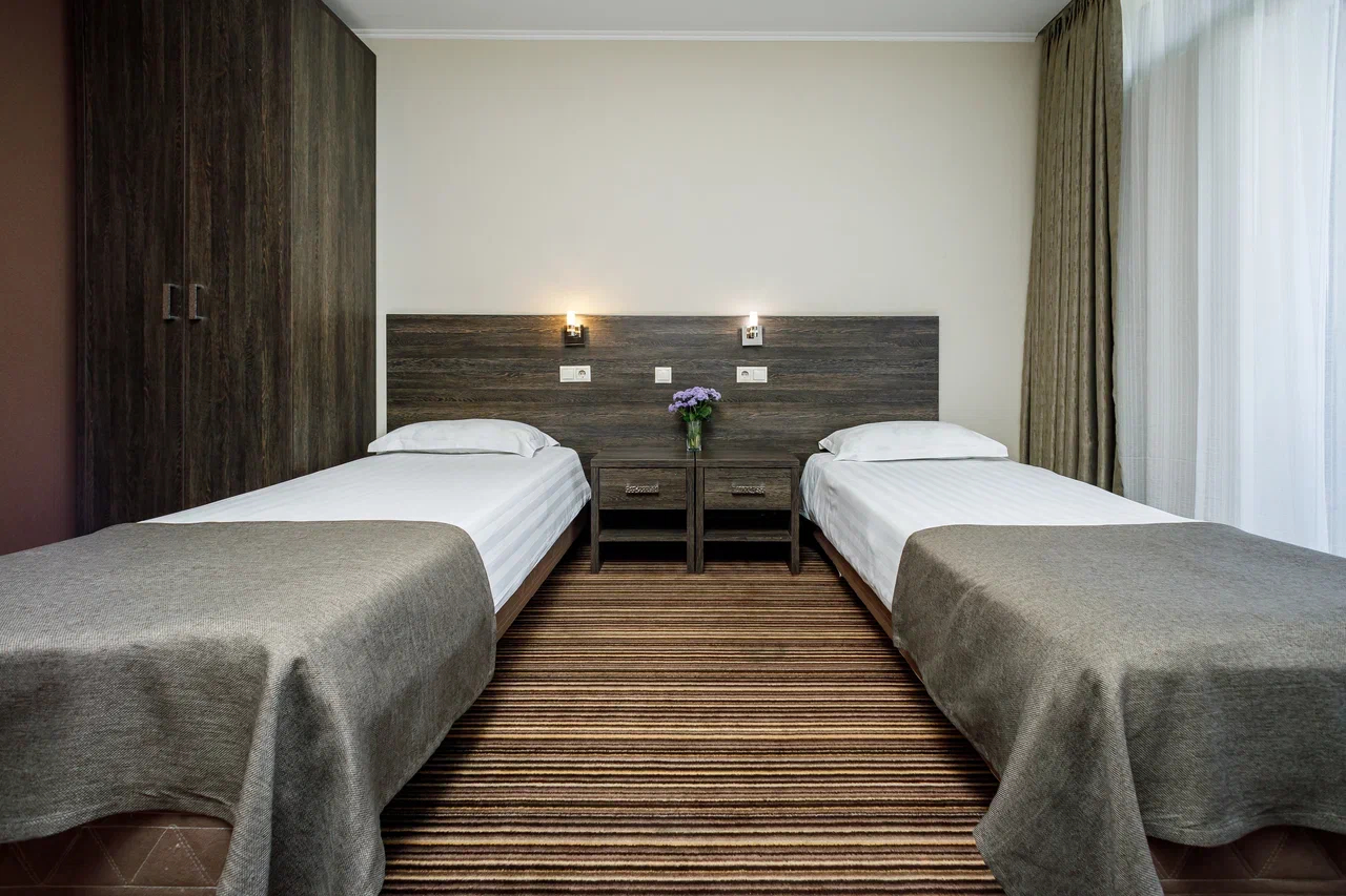 Две раздельные кровати (1мх2м) или одна двуспальная кровать, столик, две прикроватные тумбочки, платяной шкаф, совмещенный с/узел 3,5 кв.м. душ с поддоном, фен.