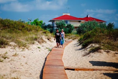 Самолетом до аэропорта г. Анапа, далее на рейсовом автобусе №127 до остановки «Цибанобалка - Трасса», далее на рейсовом автобусе №106 до остановки «Центральный пляж», далее пройти пешком 430 м до отеля.