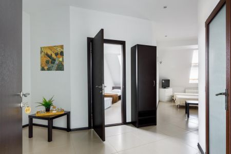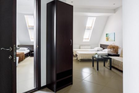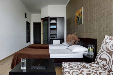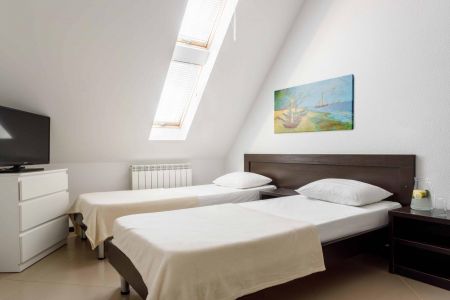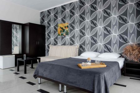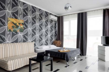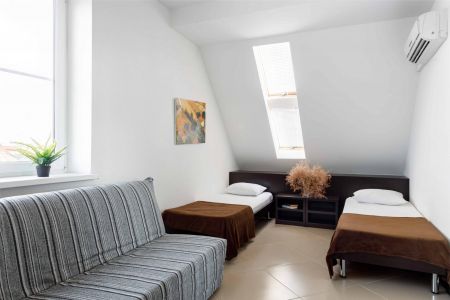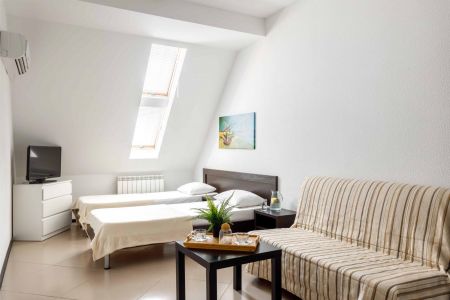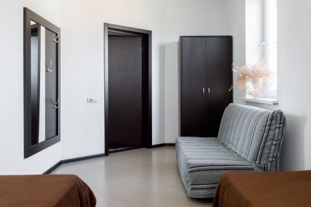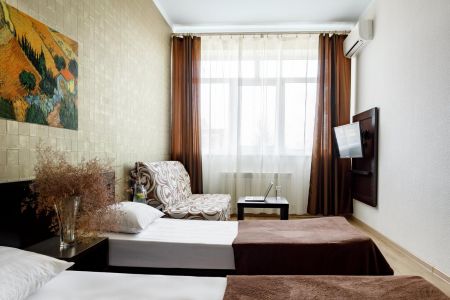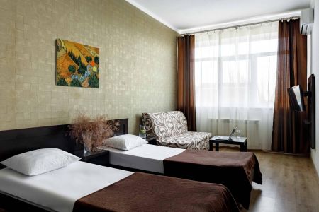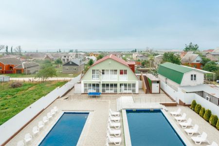 Самолетом до аэропорта г. Анапы, далее на маршрутном такси №127 до остановки «Аквапарк», далее на маршрутном такси №119 до остановки «Железнодорожный вокзал», далее на электричке «Анапа - Феодосия» до станции «Анапа - Керчь», далее на рейсовом автобусе №102 до остановки «Автостанция Темрюк», далее на рейсовом автобусе №105 до остановки «ул. Космонавтов», далее пройти пешком 350 м до отеля.