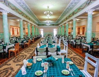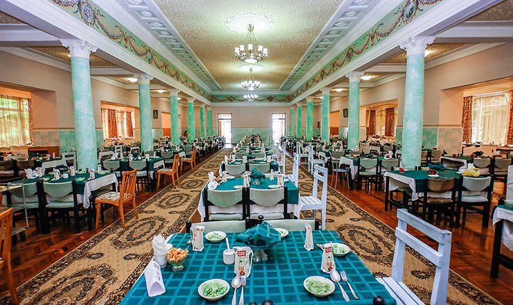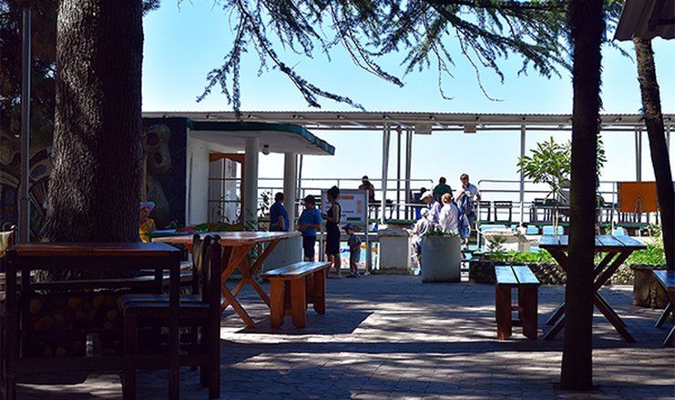 Питание гостей осуществляется 3 раза в день в столовый санатория. По назначению врача оно может быть диетическим. Кроме этого, есть бар и кафе, где готовят блюда абхазской кухни.