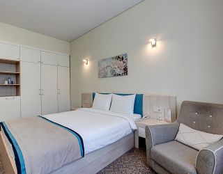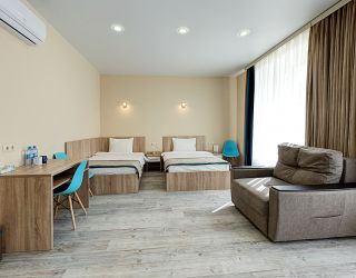 3-х этажное здание без лифта включает в себя 33 комфортабельных номера – 2-х местные категории Улучшенный, Стандарт, Делюкс и 4-х местные Люксы. В стильных номерах, интерьеры которых оформлены в светлой цветовой гамме, имеется ванная комната с душевой кабиной, современная бытовая техника – ЖК-телевизор, фен, холодильник, кондиционер.