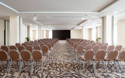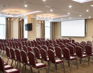 Зал располагается на 2 этаже, оснащен LCD проекторами и экранами. В вашем доступе также бесплатный высокоскоростной Wi-Fi. Есть возможность взять в аренду дополнительное оборудование: ноутбук, кликер или маркерную доску. По запросу предоставляется танцпол, сцена, LED экран