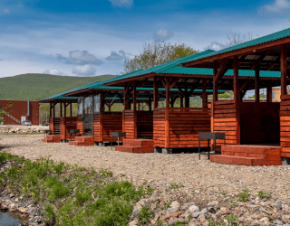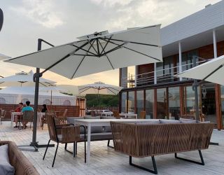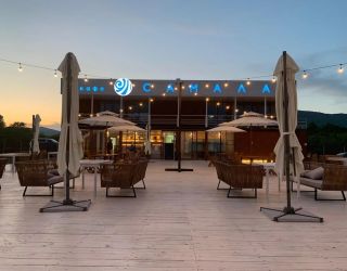 Для питания предусмотрено двухэтажное кафе, выполненное в стиле бохо с нотками морской волны. С просторной летней террасы открывается живописный вид на побережье бухты. В меню представлены блюда европейской кухни. На свежем воздухе обустроена зона барбекю - крытые беседки с мангалом, где удобно проводить время небольшими компаниями. Для проведения праздников - банкетов, свадеб и других мероприятий - на территории базы раскинулся белоснежный шатер.