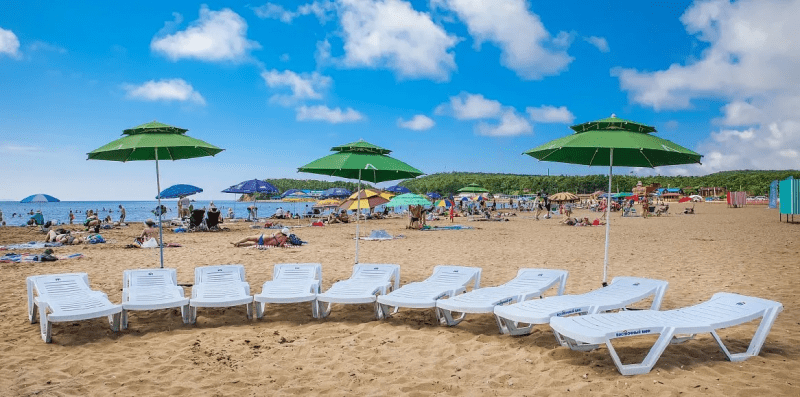 Главной достопримечательностью «Жемчужного» является большой благоустроенный пляж. Широкая песчаная береговая линия Уссурийского залива, омывающего восточное побережье полуострова Муравьева-Амурского, имеет комфортный вход в море для детей и взрослых. Пляжная зона отдыха оснащена кабинками для переодевания. На пляже ежедневно дежурят спасатели. В прокат предоставляются зонты и шезлонги. Водные аттракционы, сапсерфинг, пляжный теннис и волейбол, занятия йогой на берегу моря, детские площадки и батуты не оставят понравятся как детям, так и взрослым.