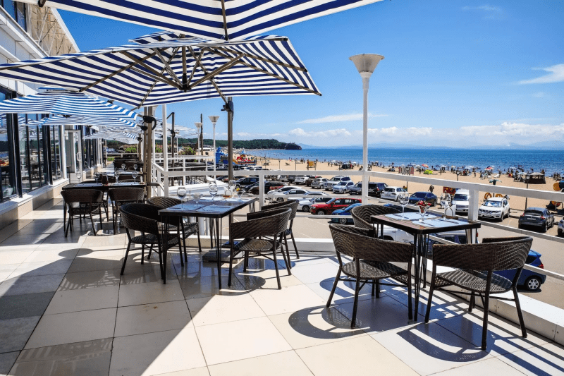 В распоряжении гостей ресторан «Круиз» с изысканной кухней, летней террасой с видом на море и детской игровой комнатой. В меню ресторана блюда русской, европейской, паназиатской кухни, морепродукты из аквариума, а также авторские десерты и напитки всех континентов. Также в любое время для отдыхающих предлагается свежая выпечка и богатый выбор блюд собственного производства. Для удобства гостей на территории работает торговый центр «Лазурный», который предлагает более 10 000 наименований продуктов питания и сопутствующих товаров. Рядом с входом в супермаркет расположен банкомат «Сбербанка». Возле супермаркета организована парковочная зона для машин, оборудованная камерами видеонаблюдения.