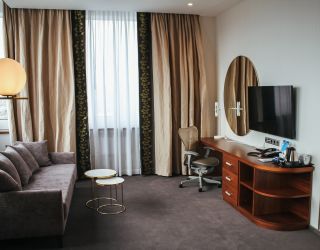 12-ти этажное здание отеля возвышается на одной из главный магистрали города – проспекте имени Ленина, из окон открываются красивые виды на город и реку. Номерной фонд, рассчитанный на единовременное заселение более 300 человек, предлагает отдыхающим номера совершенно разных категории, от Стандарта до люкса или Джуниора. Просторные, светлые и стильные номера, укомплектованы односпальными или двуспальными кроватями, есть необходимая бытовая техника и санузел с ванной или душем.