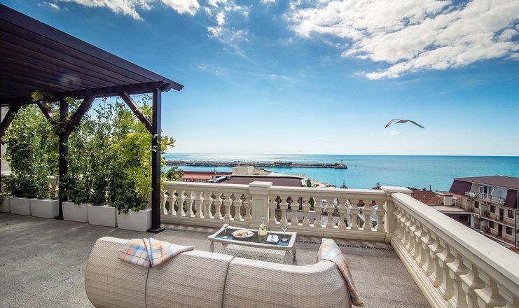 Самолетом до аэропорта г. Симферополь, далее на рейсовом автобусе «Аэропорт-Ялта» до остановки «Автовокзал Ялта», далее на маршрутном такси №15 до остановки «ул. Морская», далее пройти пешком 160 м до отеля.