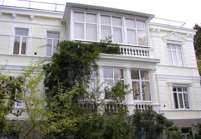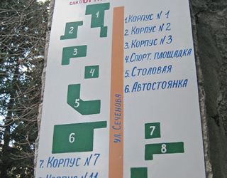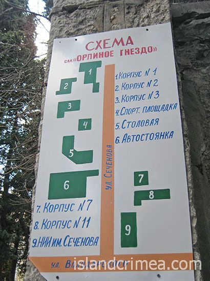 Территория санатория большая и корпуса по ней разбросаны в каком-то хаотичном порядке. Самый дальний № 1 до него дальше всего подниматься в гору (так как это Ялта, то по горам вы находитесь). В первом корпусе сан/узел в номерах, а во всех остальных корпусах - общий. Выбирать вам. Очень симпатичный корпус № 7 , старинное здание, облицованное камнем, с башенкой (мы в нём жили). Самый лучший корпус, это так называемая "Водолечебница". Это основной лечебный корпус санатория, туда все ходят на процедуры, а некоторые там живут и не они ходят к врачам, а врачи к ним ;-). Номера там хорошие, с мебелью, с кож/диванами, красивыми шторами и т.д. Короче, как дома. Стоимость этих номеров соответствующая.