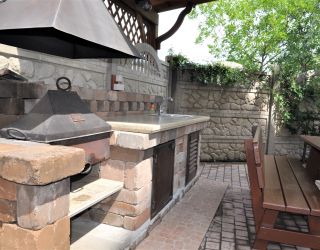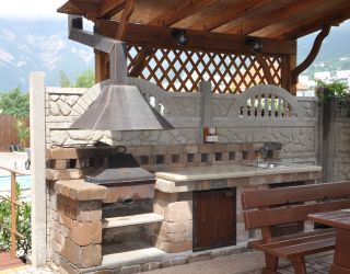 Во дворе гостевого дома, крытая под навесом, оборудованная. Есть вода, мангал, шампура, посуда, свет, вода, садовая мебель. Стоимость аренды - 300 рублей