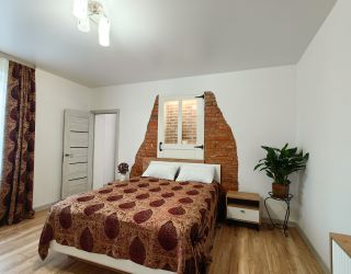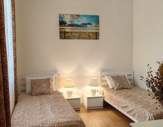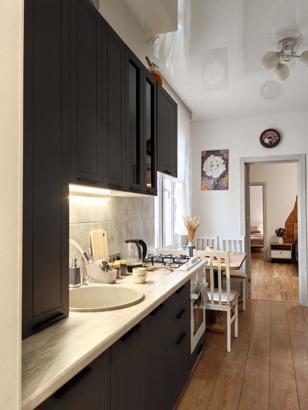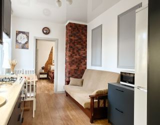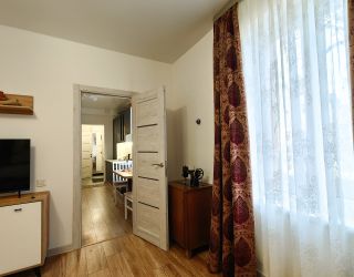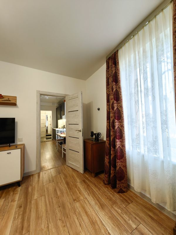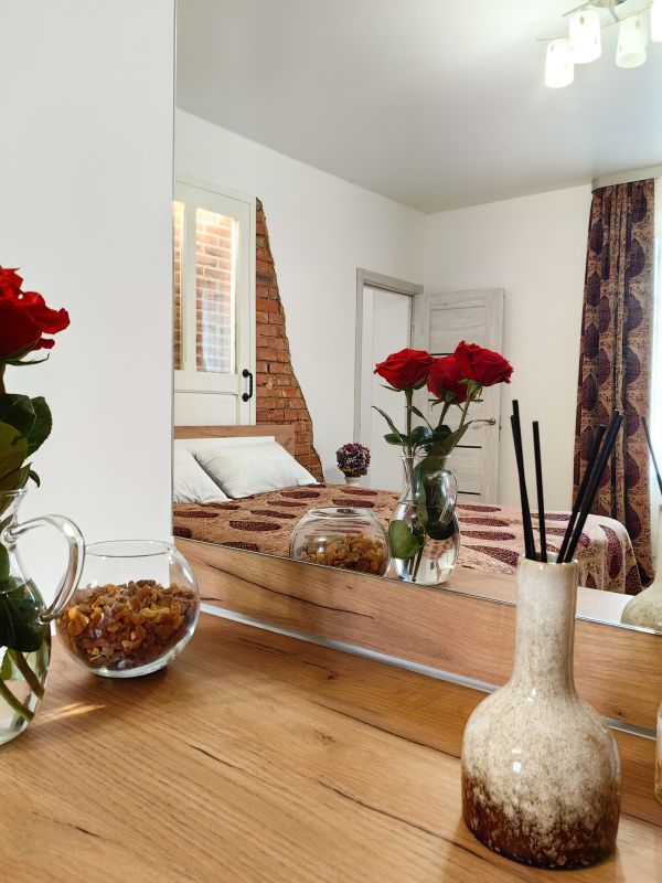 В Апартаментах 2 спальни и кухня с раскладным диваном. Новая мебель и ремонт. Главным атрибутом квартиры является старинная немецкая дверь в стене, восстановленная и облагороженная подсветкой.